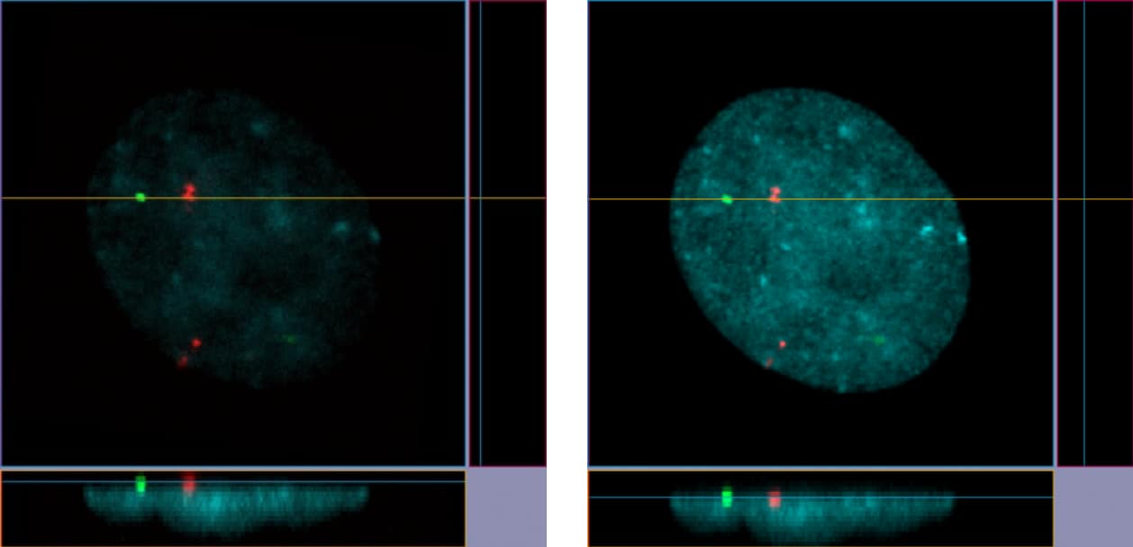 X Line物鏡的色差修正範圍為400 – 1000 nm,綠色和紅色訊號可以準確地表現在細胞核內。相較於傳統物鏡拍攝的圖像,位於細胞核底部的訊號會表現在其外部。