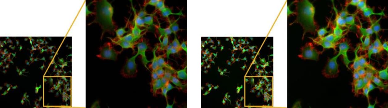 在Widefield fluorescence 下使用傳統和X Line 20x dry物鏡觀察NG108-15細胞株圖像。(藍色:細胞核,綠色:微管,紅色:肌動蛋白絲。)