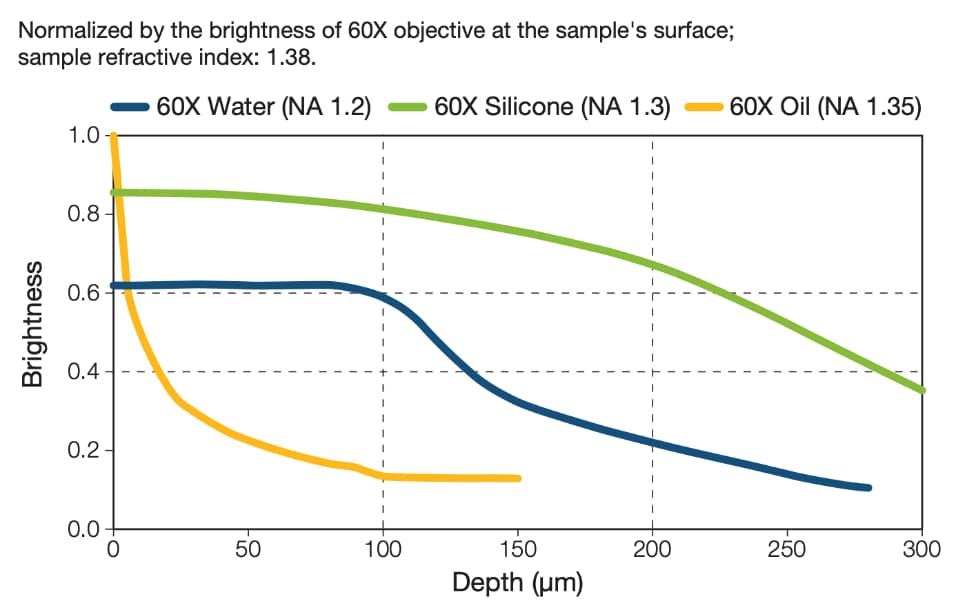 Olympus的60倍矽油鏡在200μm深度時仍能維持七成亮度,而水鏡與油鏡的亮度僅剩兩成以下。