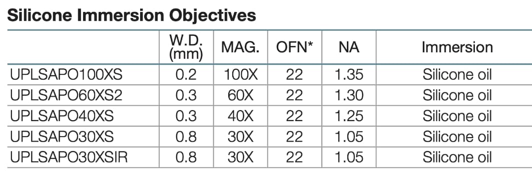 OLYMPUS針對矽油鏡一共開發了包含四種倍率的五款物鏡,最低的30倍物鏡是最適合觀察果蠅的蛹發育過程的倍率,同時也有專用於多光子系統的30倍物鏡,大幅提升了近紅外光波長範圍的穿透率,非常適合用來觀察類器官(organoid)或是幹細胞團的發育;假使樣本是厚組織或細胞團,很適合使用40倍以及60倍物鏡,也可用來觀察擴增顯微術(Expansion microscopy)的樣本;如果想要看胞器等微小結構,則可以選用100倍矽油鏡。