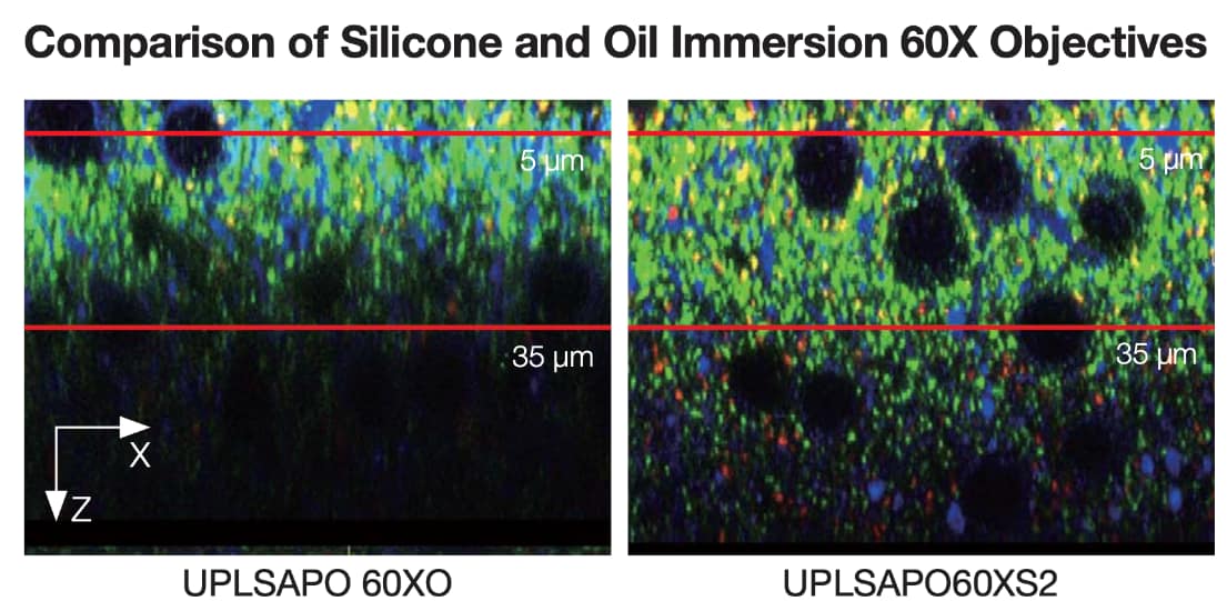 以往使用螢光顯微鏡觀察較厚的組織樣本時,往往會因為高倍率油鏡的工作距離不足,無法獲得樣本的完整資訊,而隨著樣本深度的增加,螢光亮度也會隨之驟減。針對此一問題,OLYMPUS專門開發了一系列的高解析矽油鏡,相對於一般油鏡,矽油鏡在維持高N.A.(高解析度)的同時,更有一般油鏡兩倍以上的工作距離。以60倍油鏡為例,通常工作距離為0.15mm,而且在樣本深度超過30μm時,螢光訊號便會急遽下降;但在使用OLYMPUS60XS2矽油鏡時,工作距離不僅能深達0.30mm,而且在樣本深度達200μm時,還能維持大約七成的亮度。因此在拍攝較厚樣本的螢光影像時,OLYMPUS高解析矽油鏡是最佳選擇。