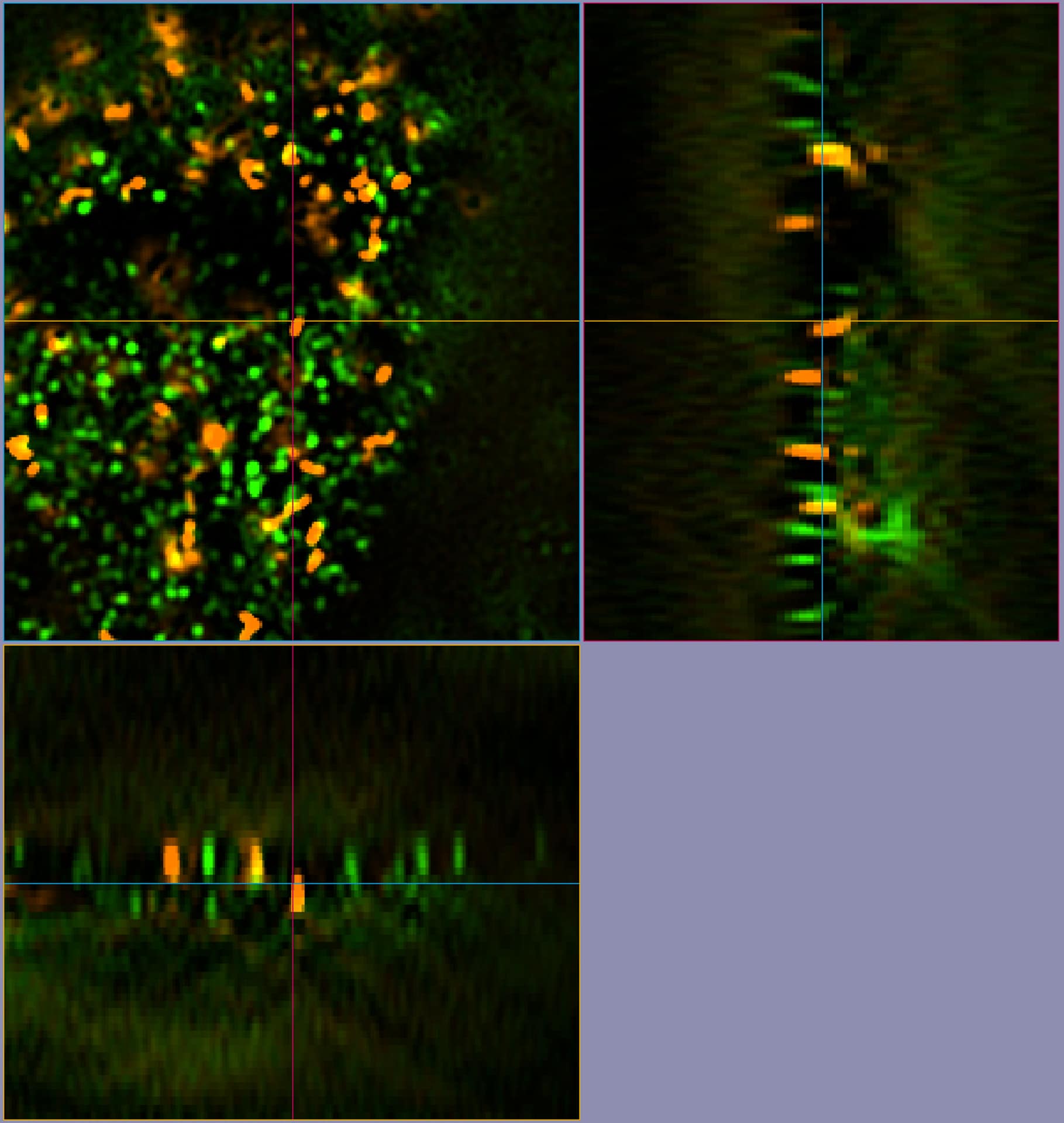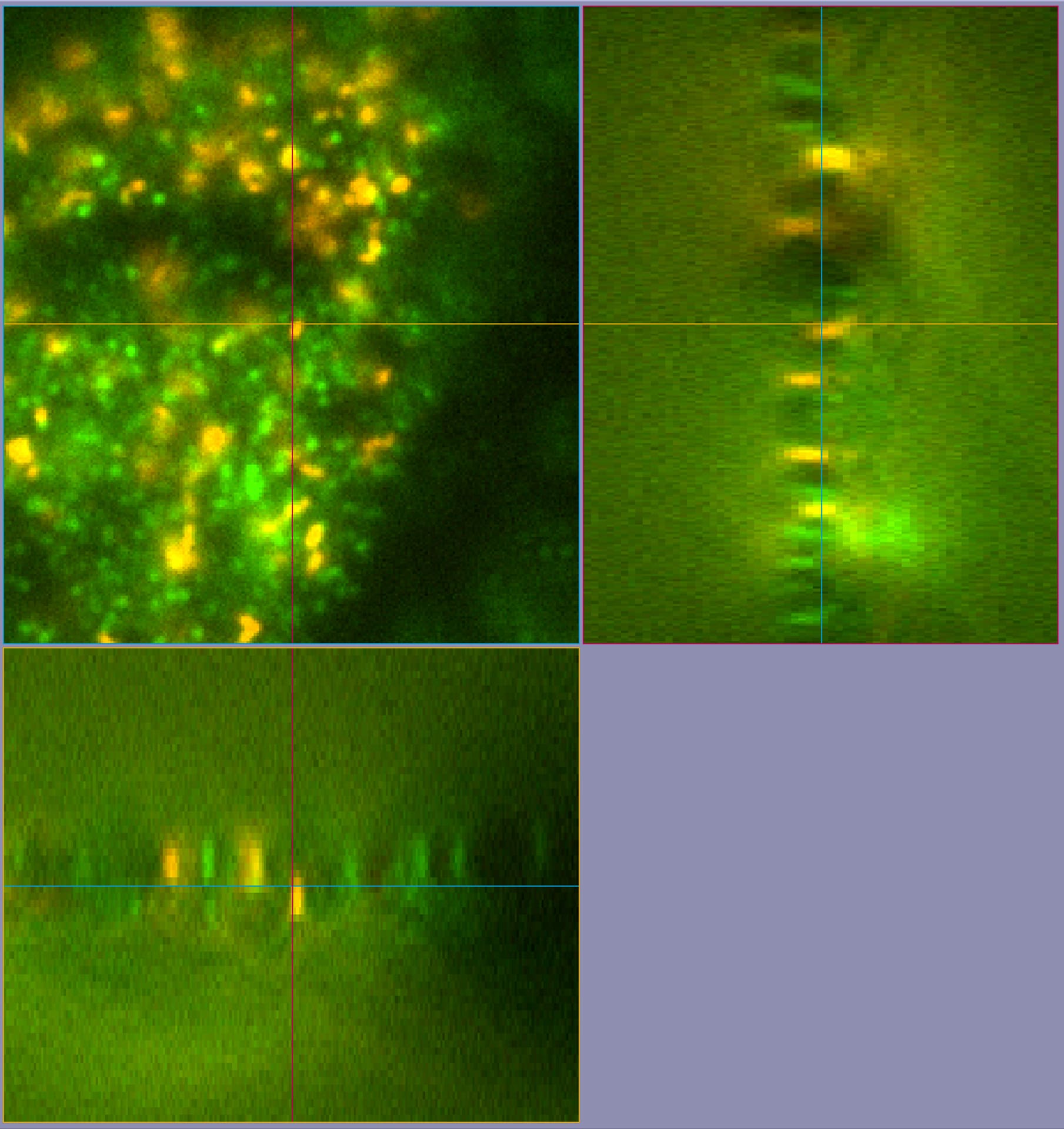 電動螢光顯微鏡所拍攝的3D立體影像,由於有了上下層之間的資訊,可利用nearest neighbor或是Weiner filter處理,得到更清晰的立體結構資訊。