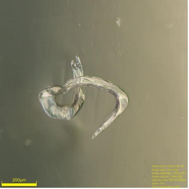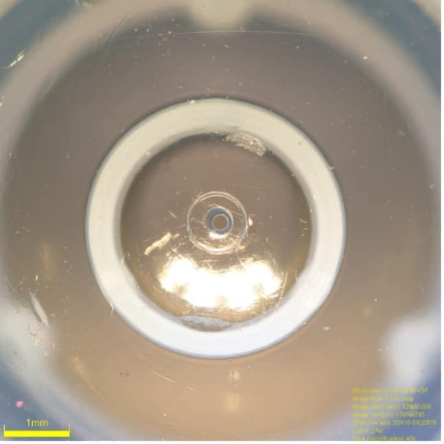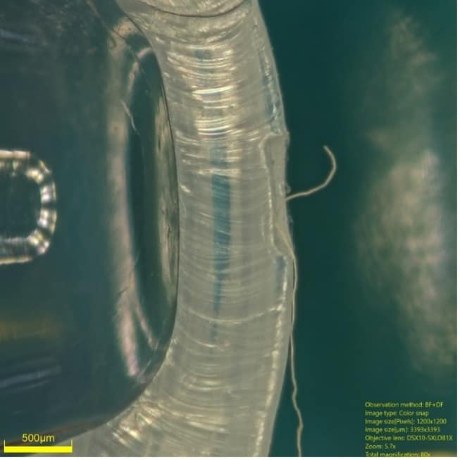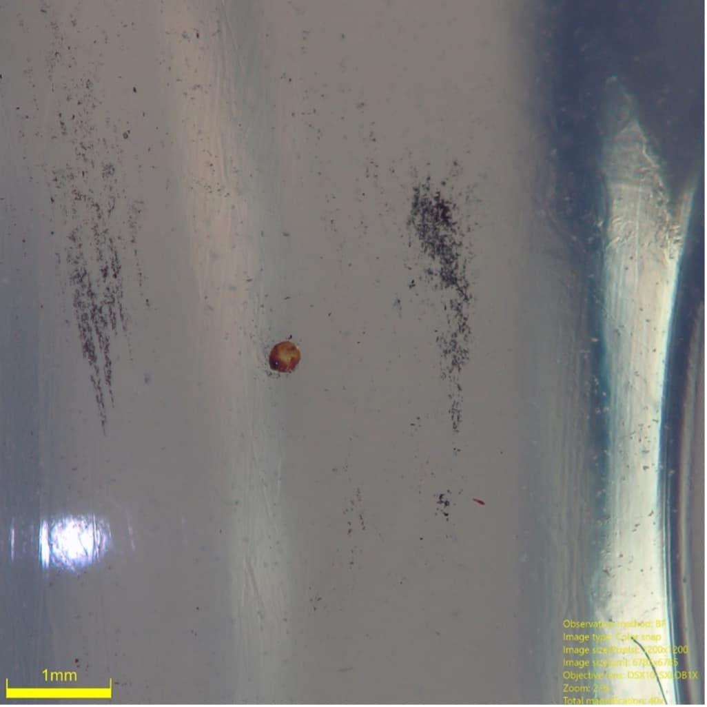 為了在具有反射表面的樣品上進行異物顆粒觀察,使用者選擇了MIX照明(明場 + 暗場),將明場的可視性與暗場的檢測能力相結合。嬰兒奶瓶奶嘴(上圖左)中的顆粒被放大了20倍,右圖則以250倍觀察另一個異物顆粒。