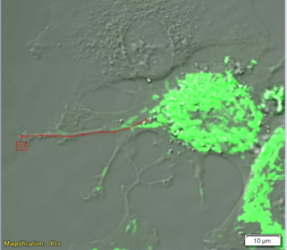 在螢光顯微影像分析中,研究者有時候會遇到需要分析特定區域中物體移動的軌跡,例如沿著神經纖維移動的粒線體或胞器等。雖然從影片中能夠清楚看出物體位置的變化,但是需要量化數據時,就可借助cellSens內建的Kymograph功能來實現。