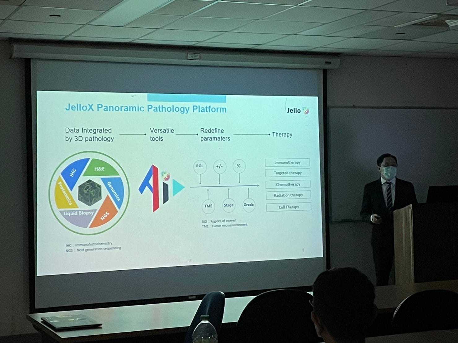 捷絡生技行銷處副處長林奇佑博士與元利儀器產品專員易德明,至國防醫學院病理及寄生蟲研究所進行「病理影像立體智慧解決方案」演講,與病理科醫師、醫檢師、研究生分享最新數位顯微技術於病理檢驗的應用方法。演講主持人為三軍總醫院病理部技術長藍國倫。