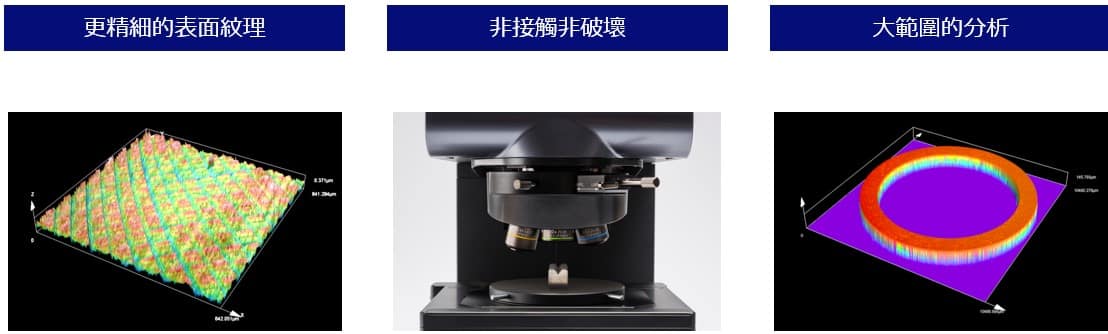 使用OLYMPUS雷射共軛焦顯微鏡OLS5100或可協助解決上述問題。雷射顯微鏡的優勢之一為可使用單線輪廓進行評估。高解析雷射圖像可檢測精細表面紋理,也可以用彩色圖像檢測。而且雷射顯微鏡為非接觸式的檢測,不會劃傷樣品;甚至能夠利用拼接功能在大範圍內進行評估。