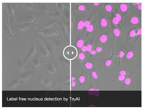 舉例說明,對於細胞計數的應用,傳統方法一定要利用DAPI或是Hoechst等螢光染劑將細胞核標定,才能進行細胞數目的統計,但是利用DAPI等螢光染劑首先會讓樣本遭受UV光線的激發,此外,利用螢光標定細胞核的同時,也少了標定其他胞器的機會’ 但是藉由AI軟體的幫助,現在只需要拍攝明視野影像便能將細胞核位置精確標定! 這項革命性的突破為細胞實驗帶來三項重要好處: