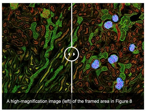 在腎臟切片中的腎小球數量與疾病也有極高的相關性,以往不論是明視野影像或是螢光影像都很難快速的將腎小球位置判別出來,這是因為傳統的辨識方法是依靠螢光的亮度來區分標定的目標,而在顯微影像中腎小球跟背景亮度幾乎沒有任何的差異,然而AI的關鍵差異能力在於目標物”型態”的判別,簡而言之,只要是人眼能判別出的形態差異,TruAI經過良好的訓練過程後,便能幫助使用者精準且快速的分辨腎小球位置與數量,做出實驗結果判讀。