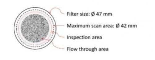 顆粒計數外推法:在濾膜中定義一個區域進行掃查,並探測其中的顆粒。這些區域可以是濾膜尺寸(整個濾膜區域)、流經區域(顆粒所覆蓋的濾膜區域)、最大掃查區域(檢測所能掃查的最大區域),以及檢查區域(由使用者定義的實際掃查區域)。