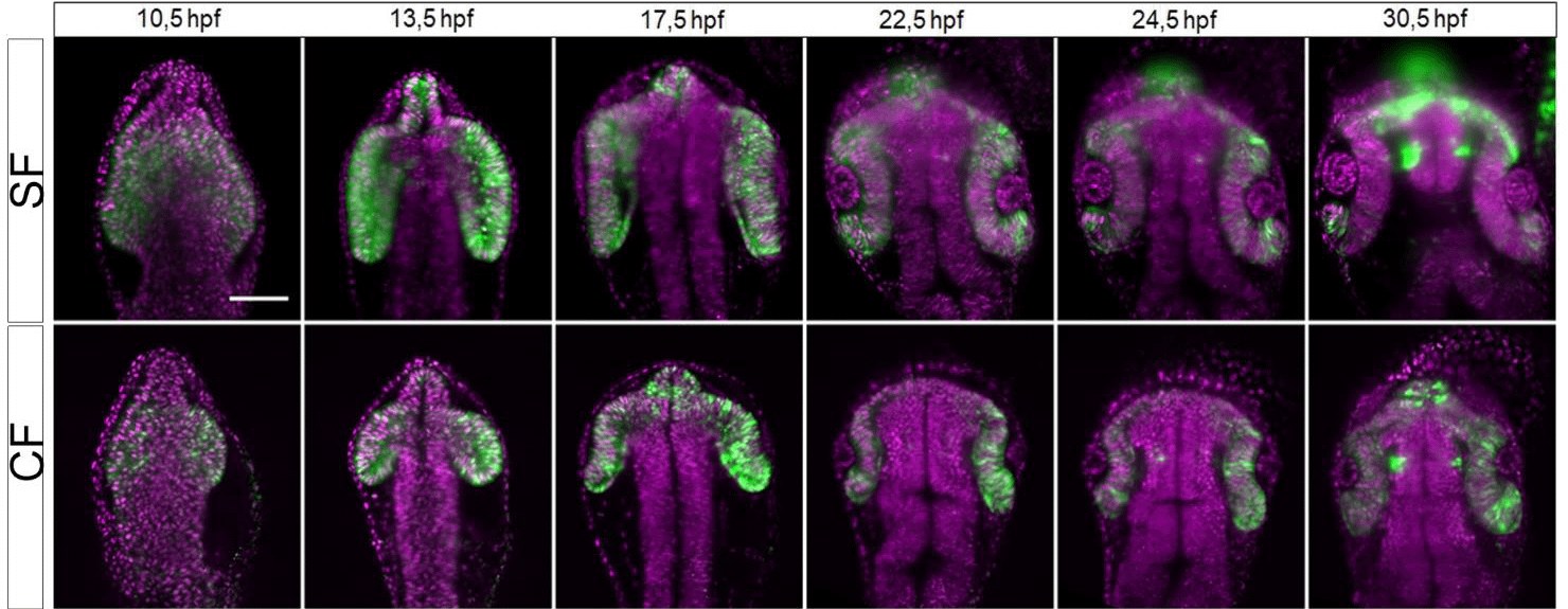 硬骨魚類模式生物因其身體外部呈透明狀,非常適合即時影像擷取,因而常用來研究動物型態發生的相關研究。例如,Devos等人在2019年使用Alpha3層光顯微鏡,比較了兩種變種麗脂鯉(地表居和穴居)在眼睛的形態發生過程,並且藉此探討發育過程中形態和模式形成的差異。該研究的目的在於檢視這些洞穴魚的缺陷,以及眼部形態發生的機制。在研究生物發育的過程上,層光顯微鏡在許多技術層面都具有優勢。Alpha3層光顯微鏡系統使用了動態範圍較廣的CMOS相機,可以有效偵測到終腦中的強螢光標記,和眼睛區域的弱螢光標記。此外,正交雙向架構的照明技術可產生較好的空間分辨率,可以將雷射光保持在較低的強度,以避免造成嚴重的光毒害,另外,即使對脆弱的活體胚胎進行了超過20小時的影像拍攝,在胚胎受精(hpf)後的48至60個小時,仍可發育成正常的頭部形態(參見下圖2)。這項研究顯示,層光顯微鏡可滿足生物學家長時間記錄生物發育過程的需求,同時將光毒害的影響降至最小(Wan等人,2019年)。