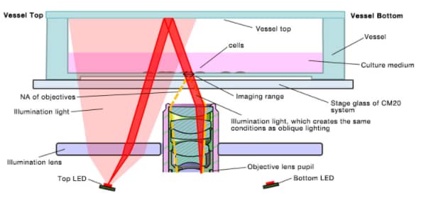 OLYMPUS獨家專利的落射偏斜照明方式,將雙光源排列於物鏡兩側,會根據容器的厚度自動調節照射角度,幫助您獲得清晰明亮的影像。此系統採用了波長630 nm的LED光源,不會對細胞造成傷害,同時能獲得接近於微分干涉差效果的細胞圖像,讓您在觀察大多數的樣本時,均能清楚分辨個別細胞或細胞團。