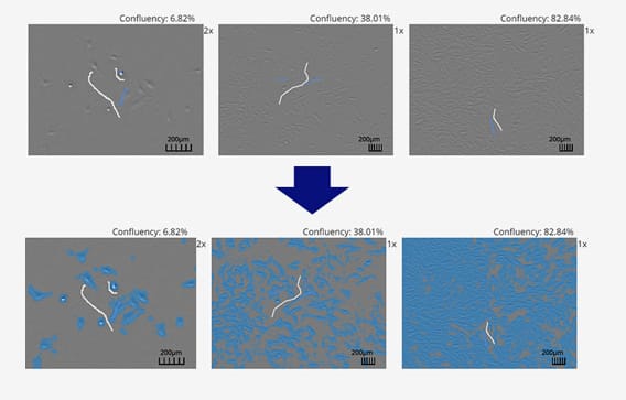 CM20除了自動對焦拍照,最強大的功能之一在於能夠針對拍攝的影像自動進行分析與資料整理,而這也是傳統實驗室當中最耗費人力以及時間的工作。CM20可以透過AI輔助功能自動判定細胞樣本與背景之間的差異,並藉由影像計算出細胞數量、細胞密度以及樣本倍增時間,更可以比對不同孔位或是批次之間的差異,確保樣本的品質,同時加速實驗的流程與效率。