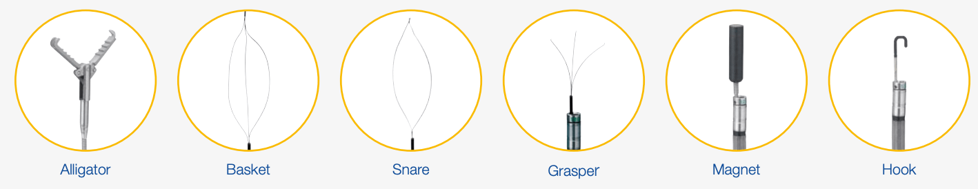頗受歡迎的兩個工具是鱷魚夾和套圈。鱷魚夾長約2.54釐米(1英寸),端部有兩個帶齒的金屬片,用於抓取異物碎片。檢測人員可以手動控制抓取的力度,以穩妥地拾起並取回物件。