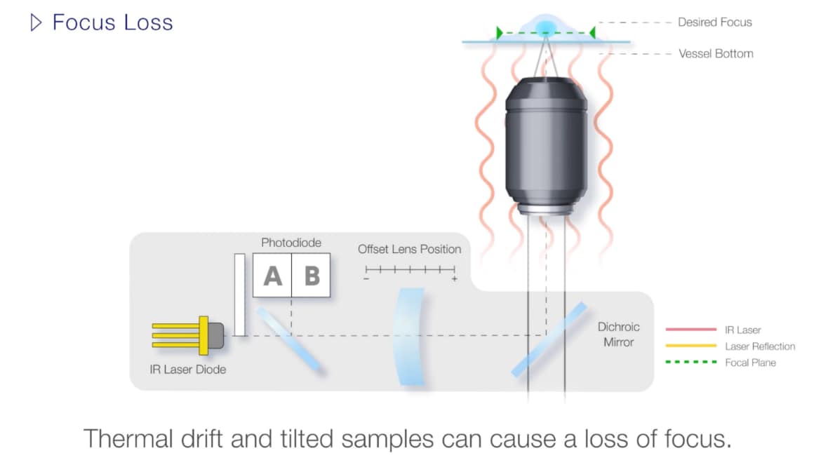 在倒立顯微鏡中,對焦機制是藉由調整裝載著物鏡的鼻輪,使其上下移動來達成,而移動的原理則是仰賴內部齒輪構造的運轉,因此當環境中的溫度改變時,就會使得內部齒輪熱漲冷縮,同時影響對焦的高度,這在使用高倍率油鏡的實驗中會更加明顯。此外,由於重力的影響,也會使得物鏡逐漸偏離原本的高度,因而失焦。