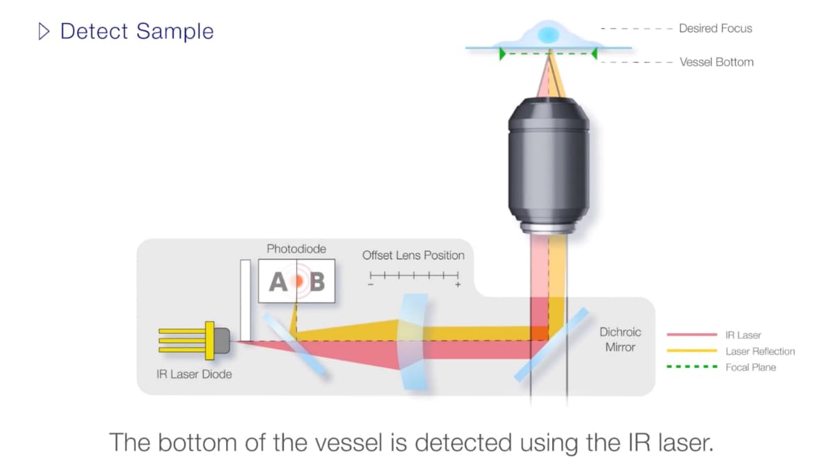 雖然物鏡與樣本的距離會改變,但是樣本與培養容器底部的距離仍保持恆定,只要觀察的細胞或組織不是懸浮在培養液中,那麼只要能夠讓顯微鏡找回容器底部的深度,就能回推當初拍攝時正確的Z軸位置。