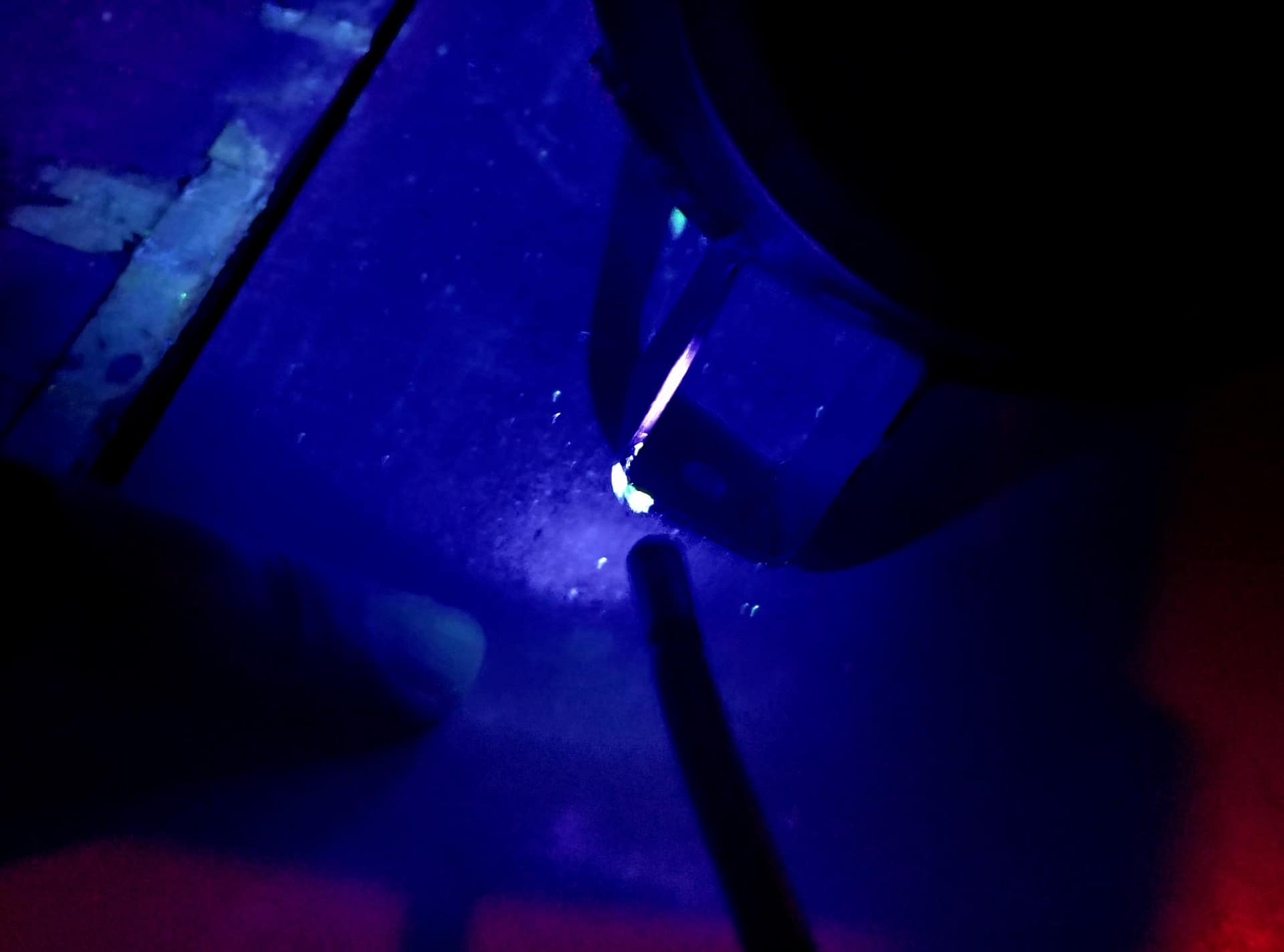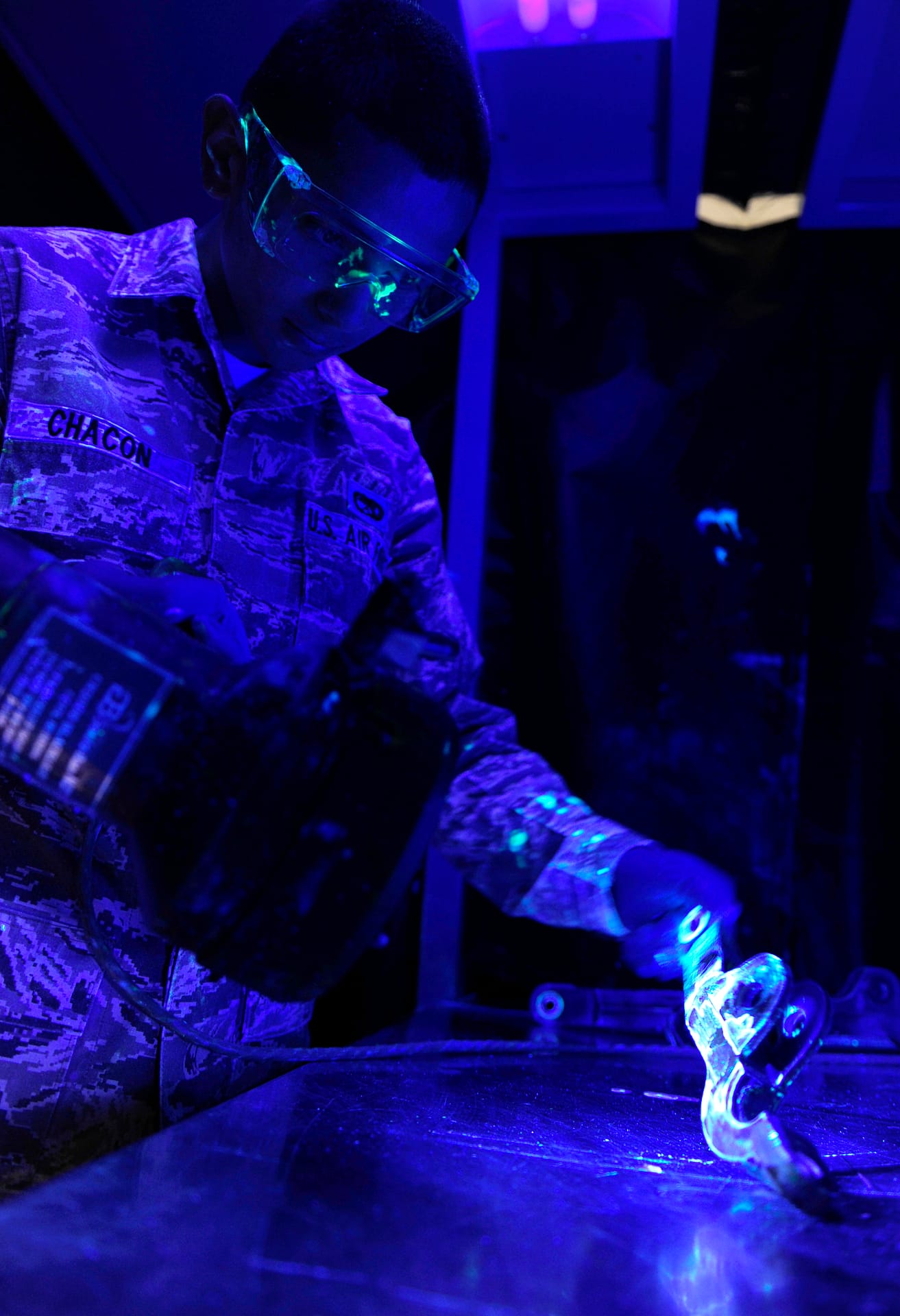 在UV光照射下,塗抹了螢光染劑的機件便會發出螢光。(來源:Senior Airman Tiffany Trojca, USAF)
